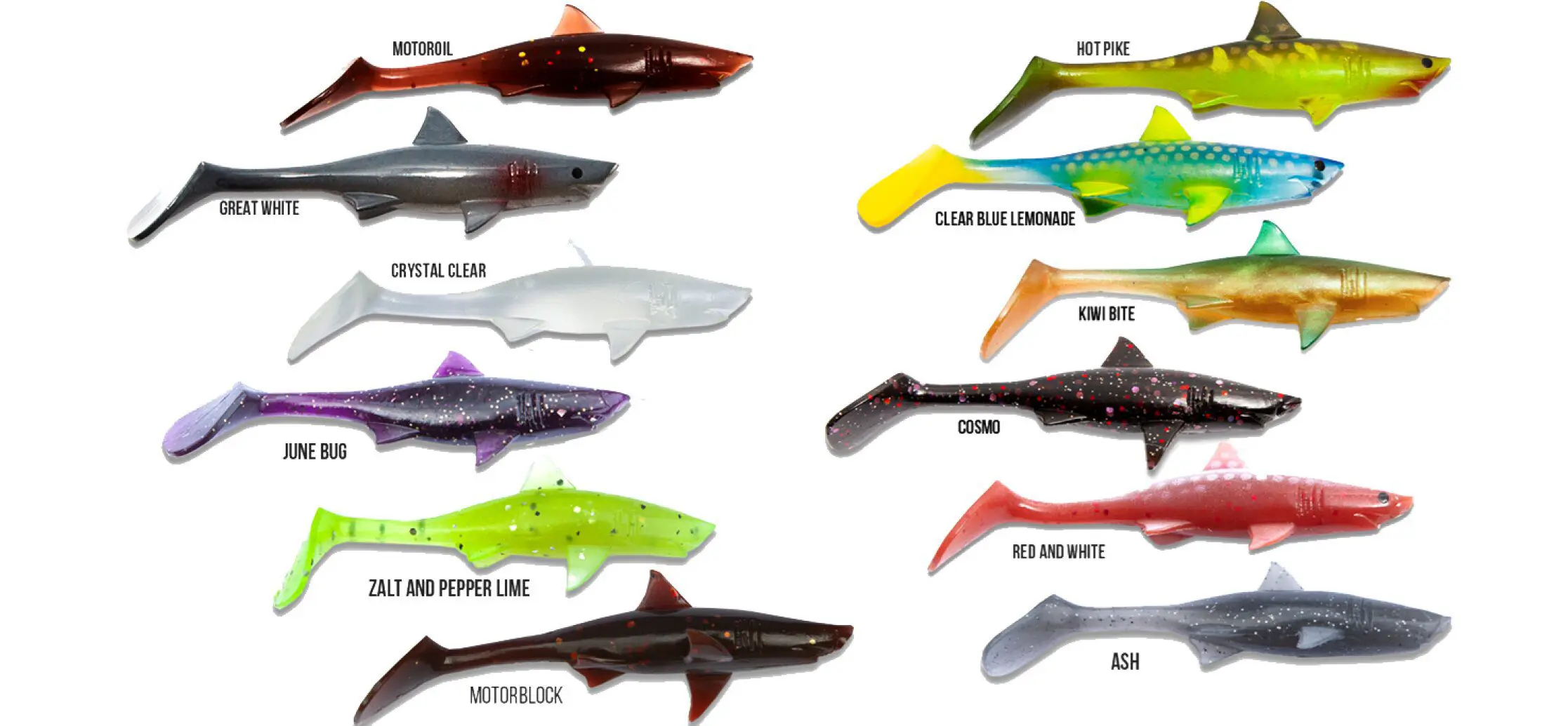 | Färg | Motoroil, Great White, Hot Pike, Kiwi Bite, Clear Blue Lemonade, Cosmo, Zalt & Pepper Lime, Ash, June Bug, Motorblock, Pumpkin |