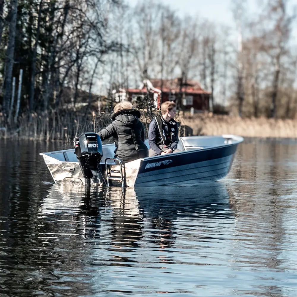 Helsvetsat aluminiumskrov. 4.4 x 1.8m, 135kg, max 30hk. 5 passagerare.